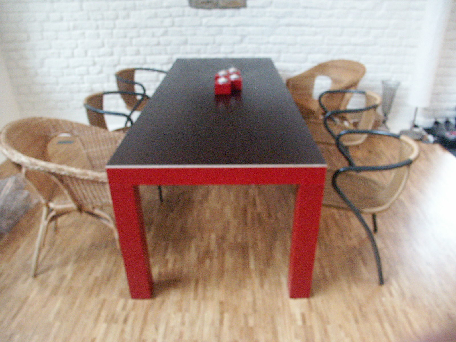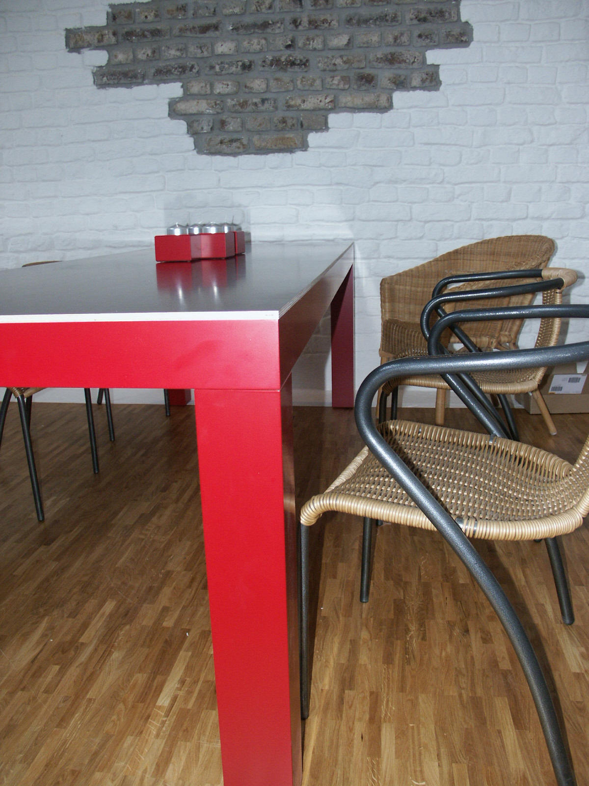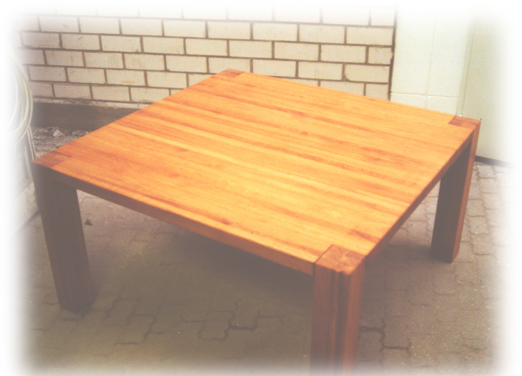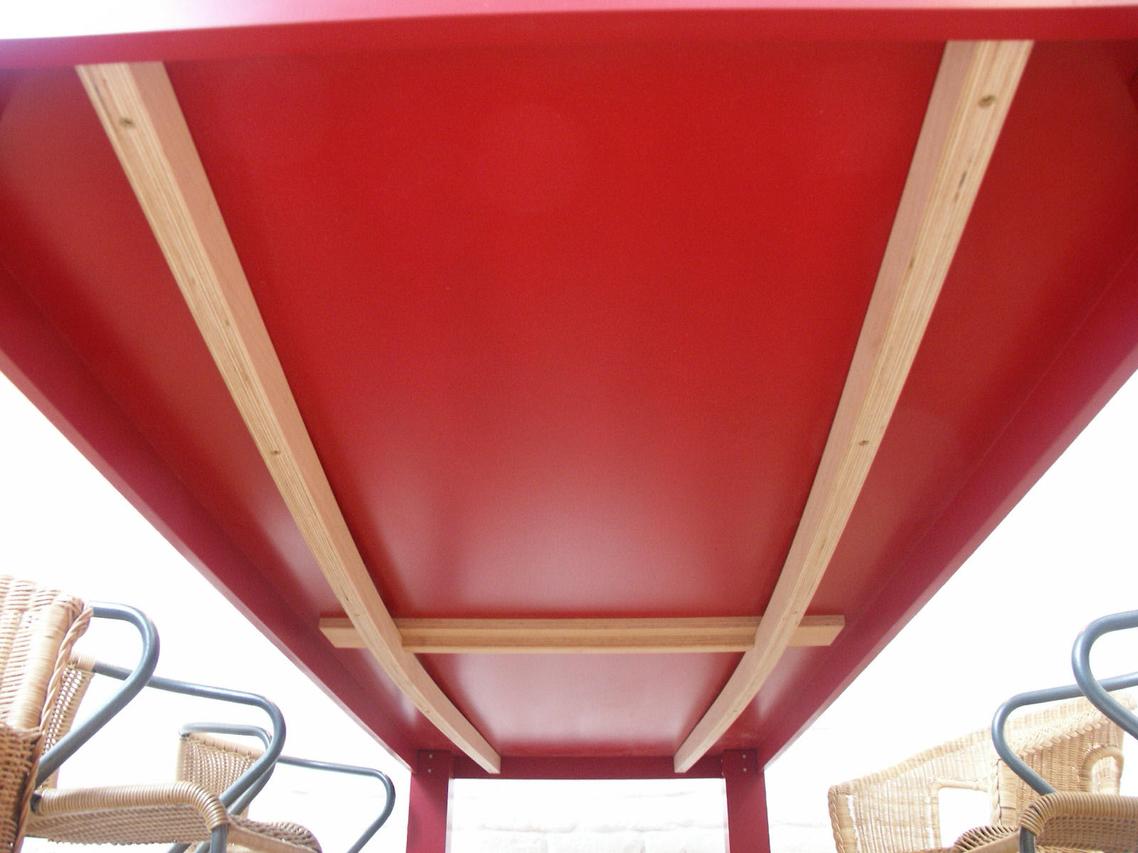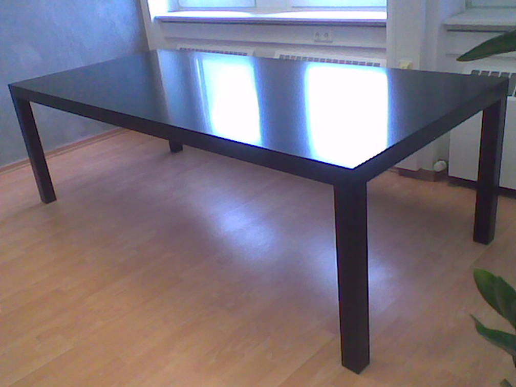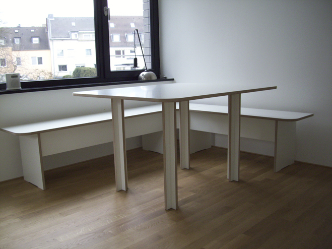aus lackierten Tischgestell und Planboardauflage |