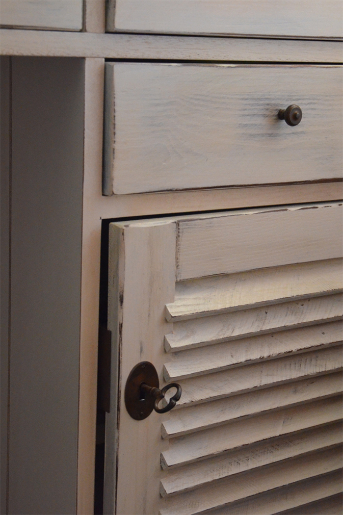 Schreibtisch mit Lamellentüren gefertigt und dann mittels Lackiertechik gealtert. |