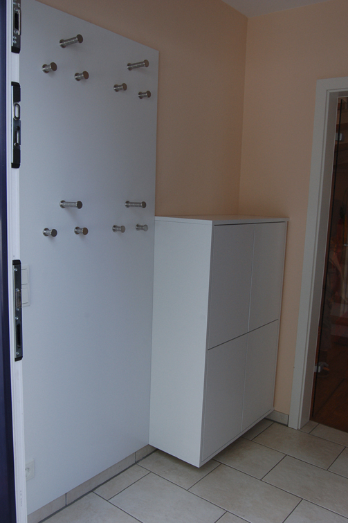 Platte aus MDF Weißlack mit Edelstahlhaken und Schuhschrank mit griffloser "push to open" Front |