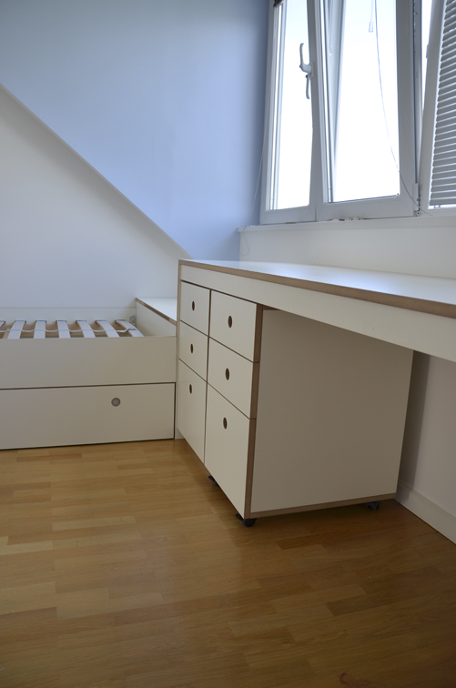 Schreibtisch, Container und Bettkasten aus MDF weiß beschichtet